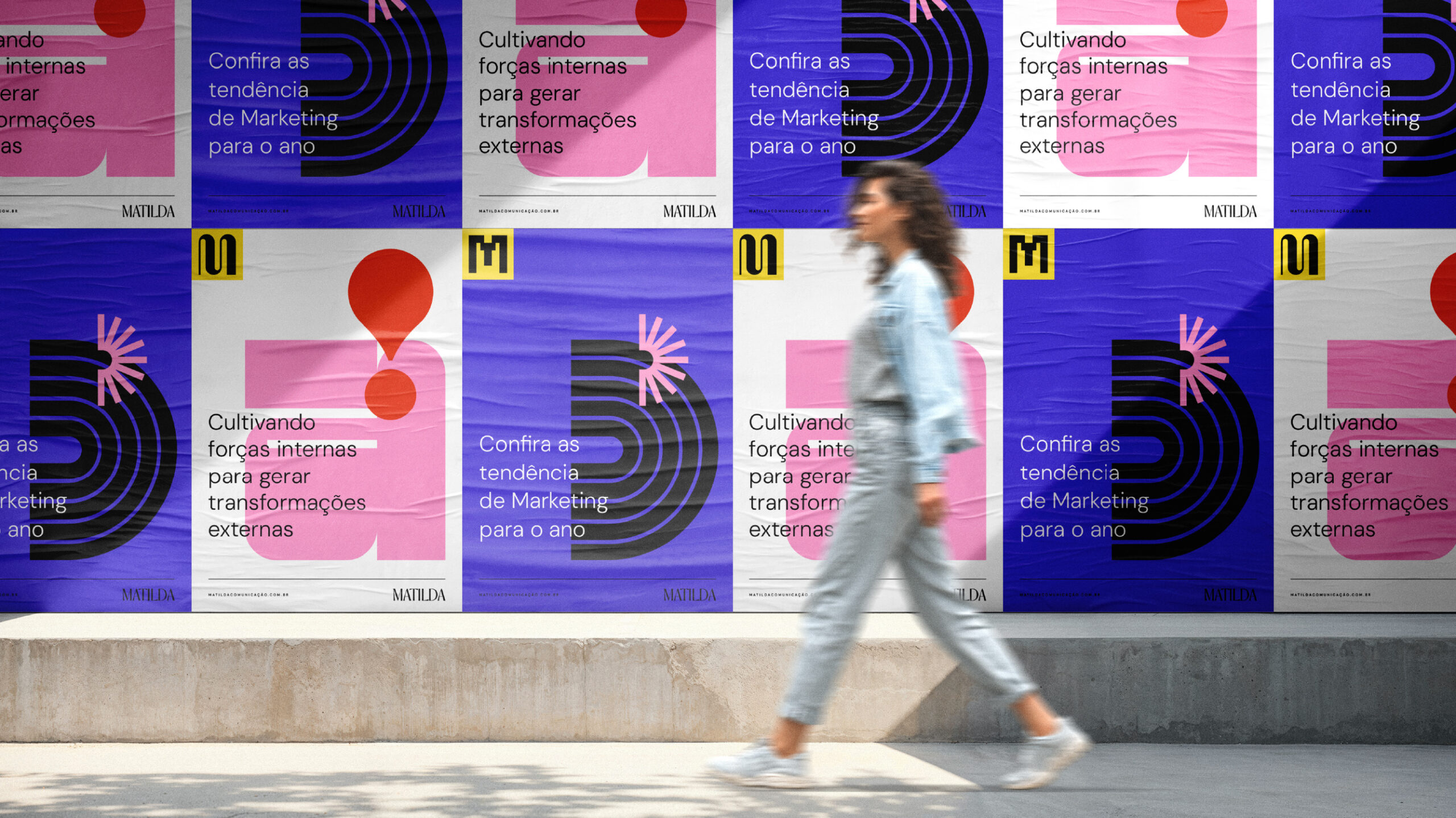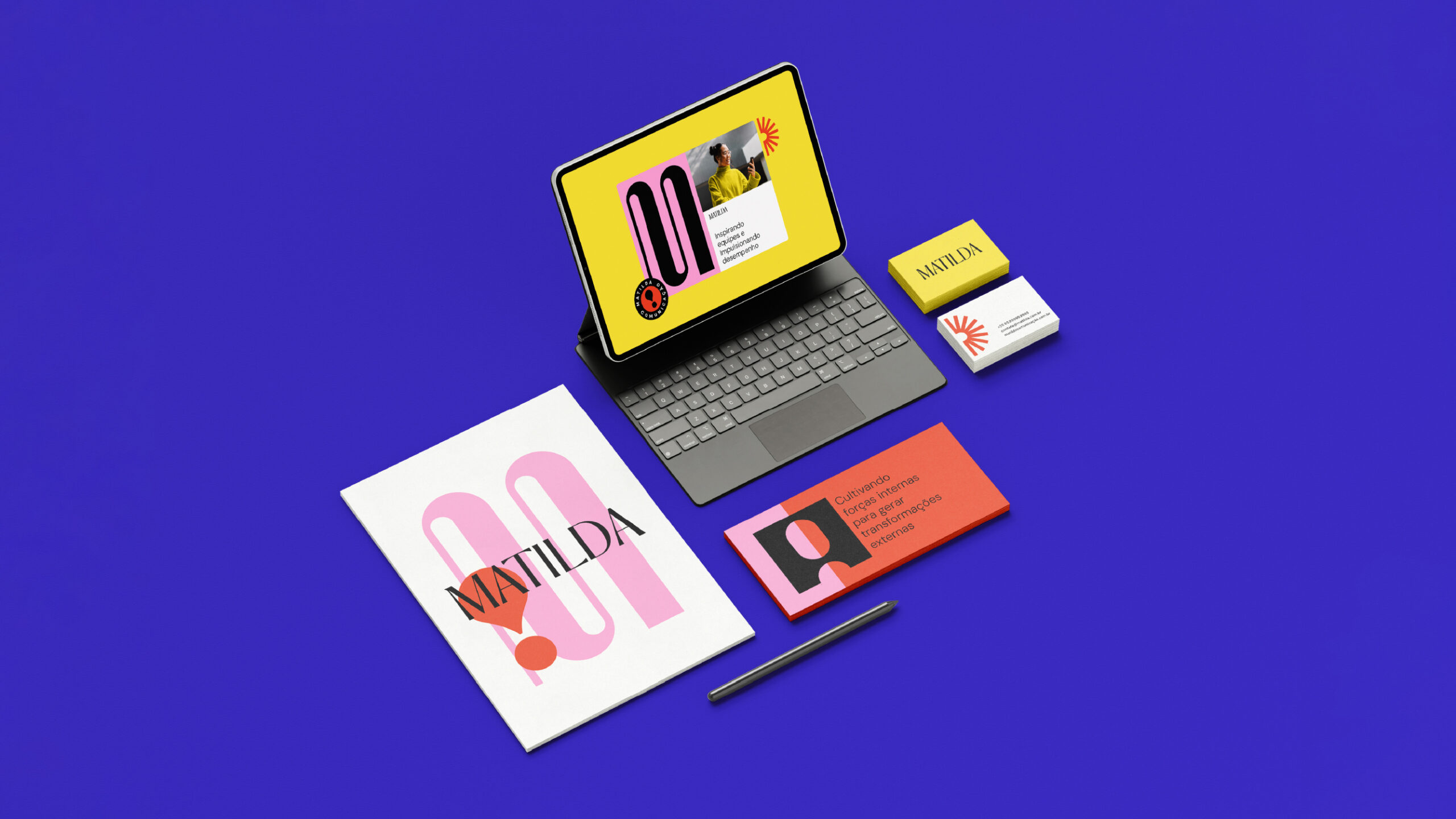 Para este projeto, desenvolvemos toda a plataforma de marca e a identidade visual. O design cambiante foi nossa resposta estratégica para comunicar o principal pilar da marca: a transformação. Como a Matilda atua diretamente na mudança da cultura organizacional de seus clientes, precisávamos de um sistema visual que representasse dinamismo, adaptação e fluidez.
